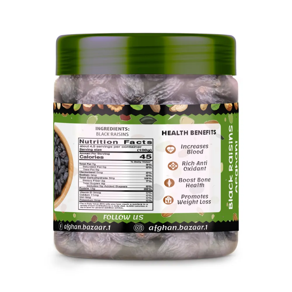 Black Raisin Afghani is a premium dried fruit sourced from the fertile valleys of Afghanistan. These seedless black gems are naturally sundried, offering a bold, sweet taste and a wealth of health benefits rooted in centuries-old traditions.