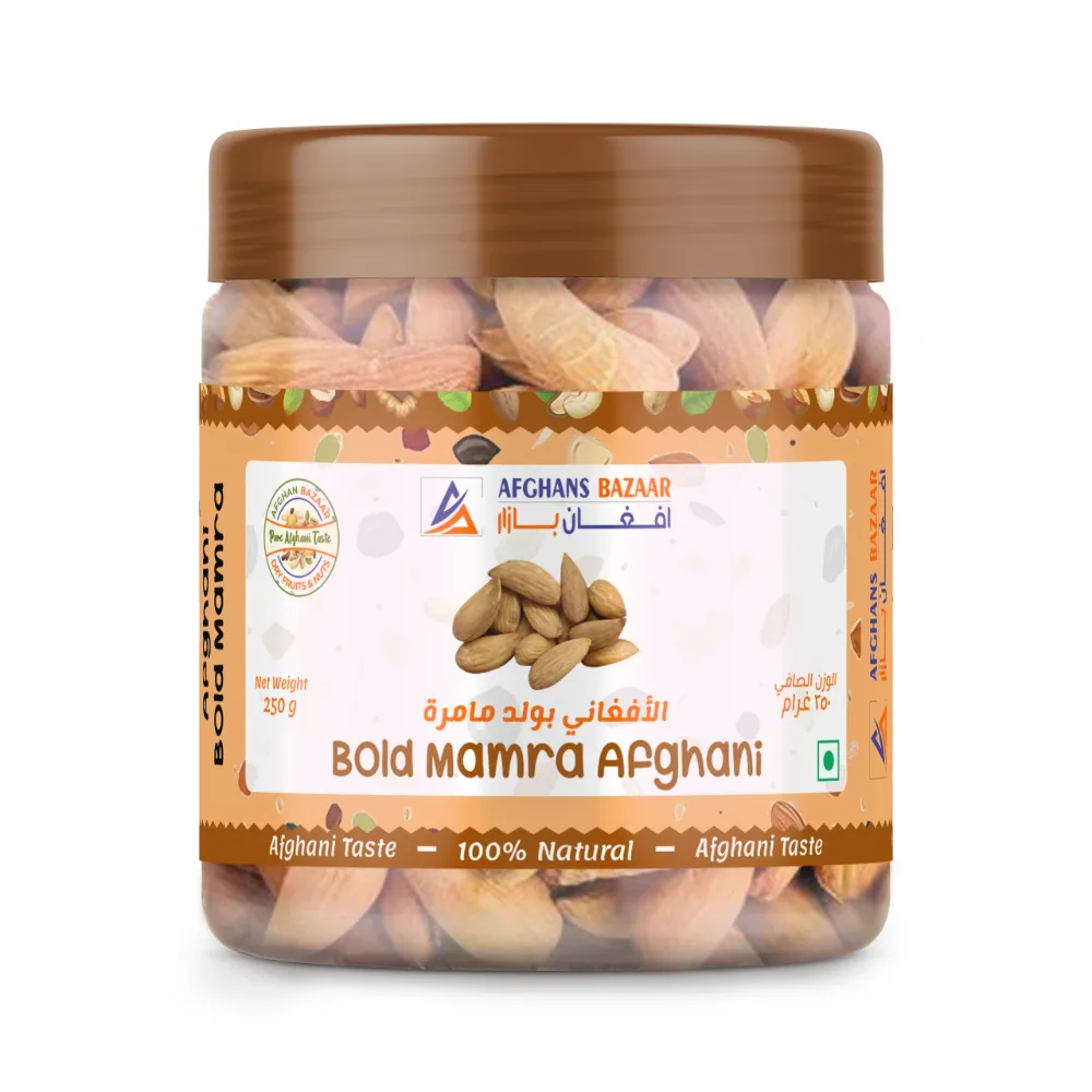 Afghan Bazaar’s Bold Mamra Almonds are naturally crunchy with a rich taste, making them ideal for daily snacking and traditional use.